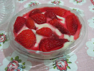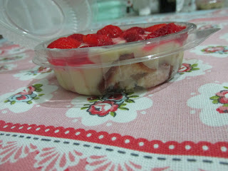 Em um potinho com tampa coloque uma camada do bolo cortado bem fininho, uma do creme ,os morangos cortadinhos e uma camada de gelatina.E está pronto .Coloquei na geladeira por umas 2 horas e bom apetite...Muito bom!!!! Lá se foi uma jacada na dieta...Mas ninguém é de ferro.